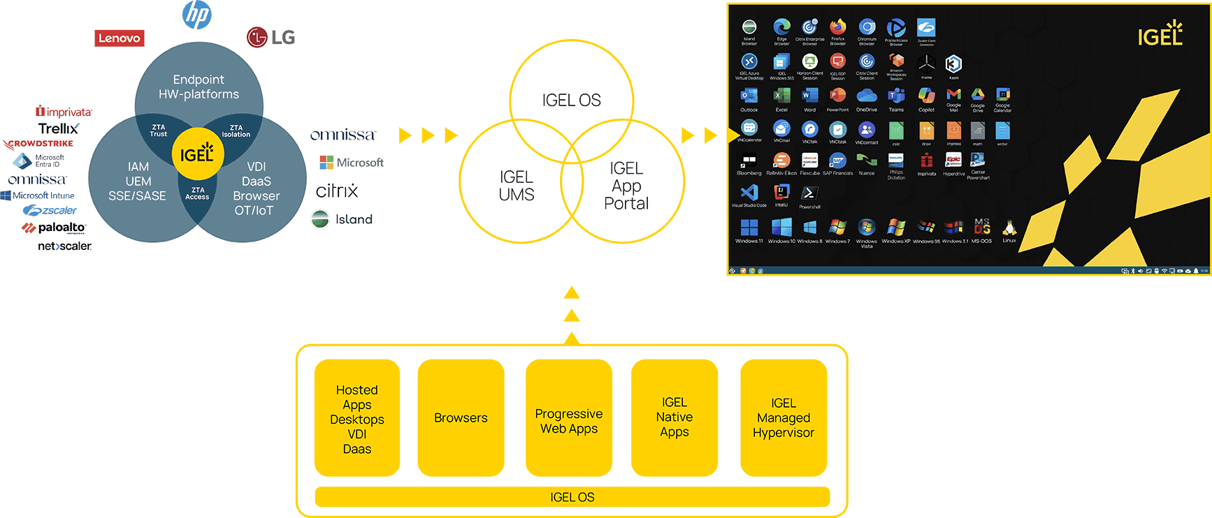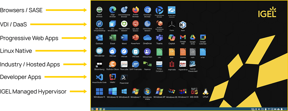 IGEL OS supports five application delivery methods, select one or multiple from VDI, DaaS, enterprise browser, progressive web apps, IGEL native apps, and the IGEL Managed Hypervisor.