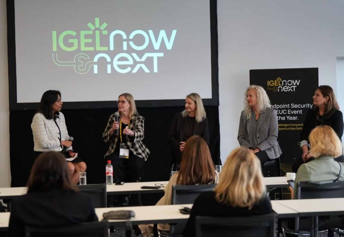 The recent Breaking Barriers and Building Careers panel at Europe’s biggest Endpoint Security and End User Computing event, brought together influential female leaders from across the IT industry to exchange practical strategies for career progression, leadership, and sponsoring. The panel included ( as shown in the image):
