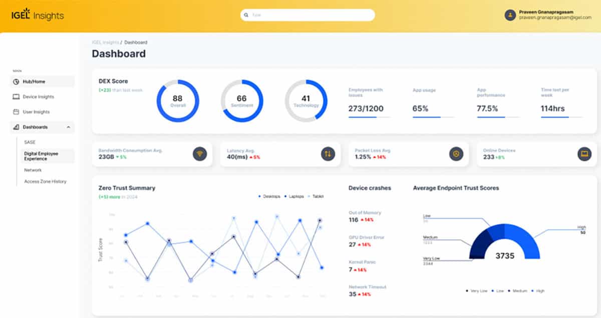 We’re currently in discussions with a number of leading DEX and similar vendors within the IGEL Ready ecosystem. Our goal is to make available 100% of the insights we generate to these vendor platforms our customers rely on every day – providing a single pane of glass for everyday operations yet still the ability to leverage the IGEL Insights web console whenever needed. Channel partners have an opportunity to drive more strategic conversations with customers and better position them for success through a deeper understanding of their environment and goals.
